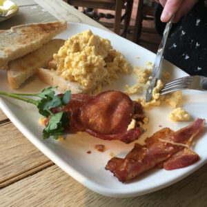 It’s hard to tell, but it’s snowing. I must admit it was nice sitting in a warm room eating scrambled Eggs on Toast with Bacon, while watching the flurries pass the window. Over breakfast we decided to take a one train stop visit to Dawlish. But first we had to get to the train station. Taxi drive number two of the holiday. On the train, outward bound for the beautiful seaside town of Dawlish….