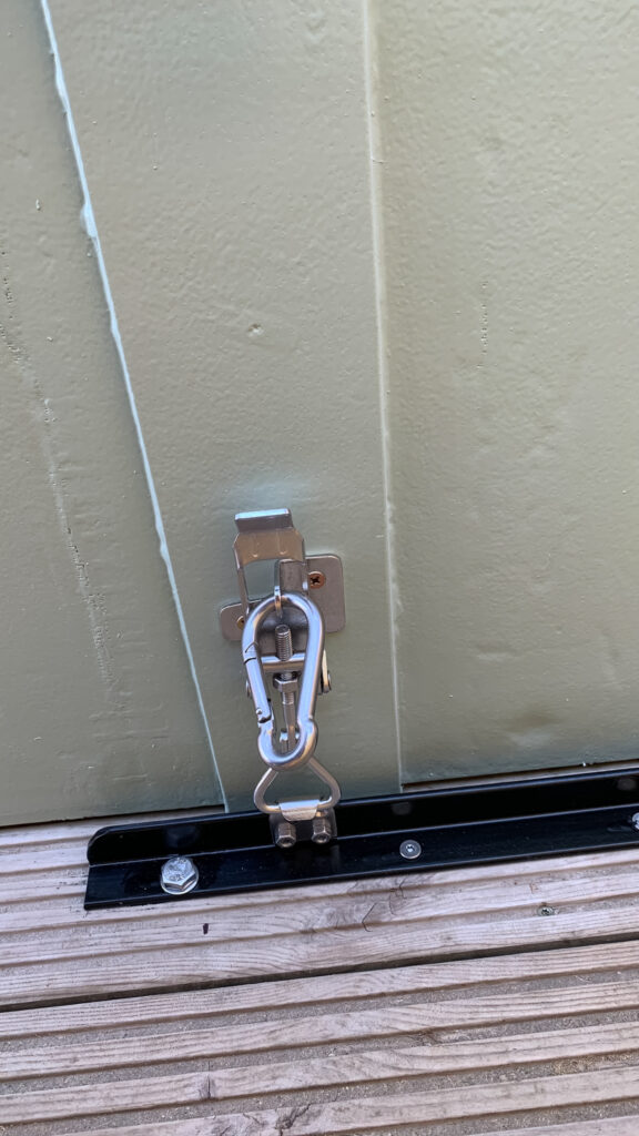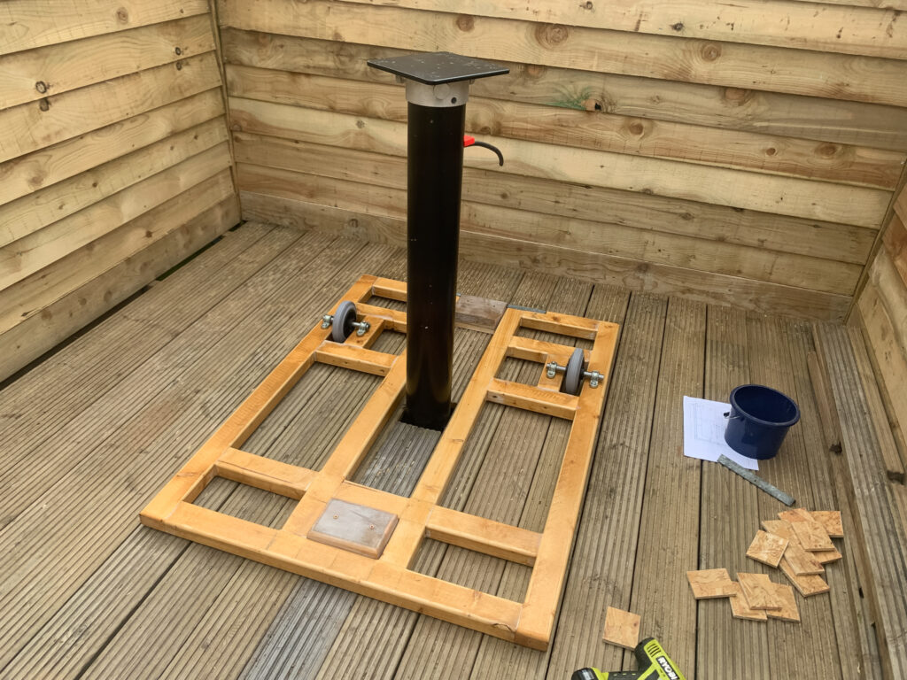 The major supporting structure is made of an epoxy coated wooden frame, which allows all the forces acting on the foam to be transferred back down the observatory floor. To hold everything down, I used four up and over catches which connected with a 30mm x 30mm angle iron bolted to the floor. Even in the 60-70mph winds we get here, this observatory isn’t going anywhere.