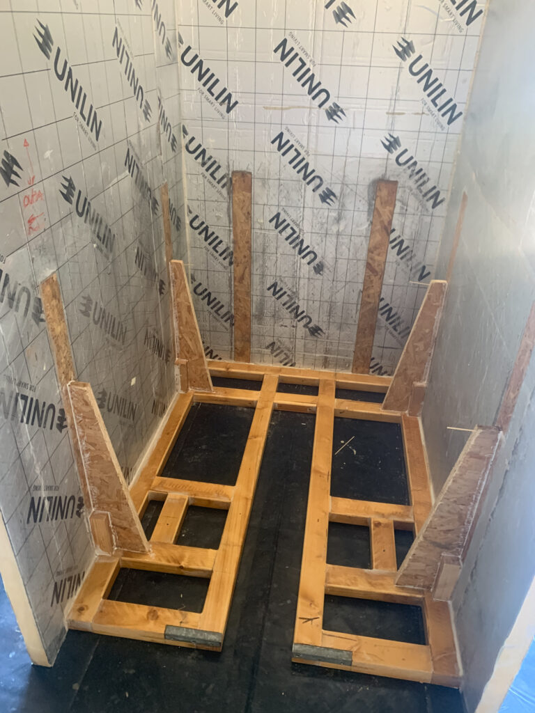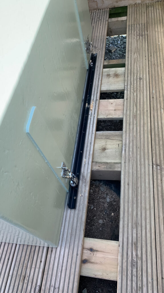 A couple of wooden blocks bolted to the floor allow the framework to be guided past the pier and also stop the framework lifting at the door end and sliding from side to side.