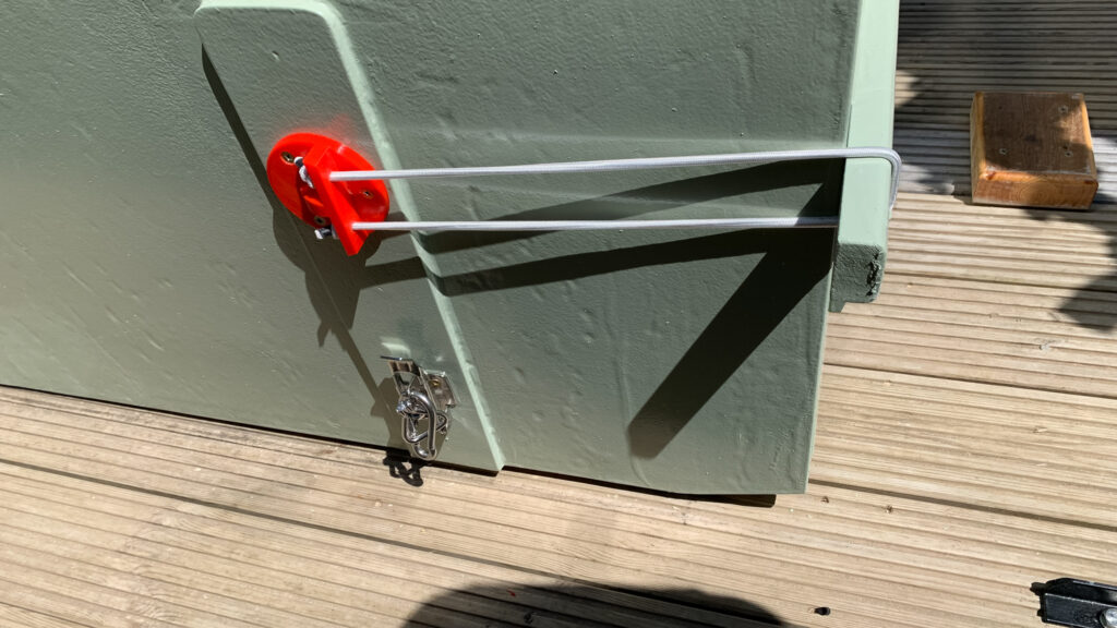 I 3D printed the red brackets that hold the shockcord then then just passes over the door braces to hold the door in place. While this sounds a little naff, it is so simple to make, is easily repaired, requires no mechanical engineering and is easy to open and close the door panel with minimum of fuss in the dark.