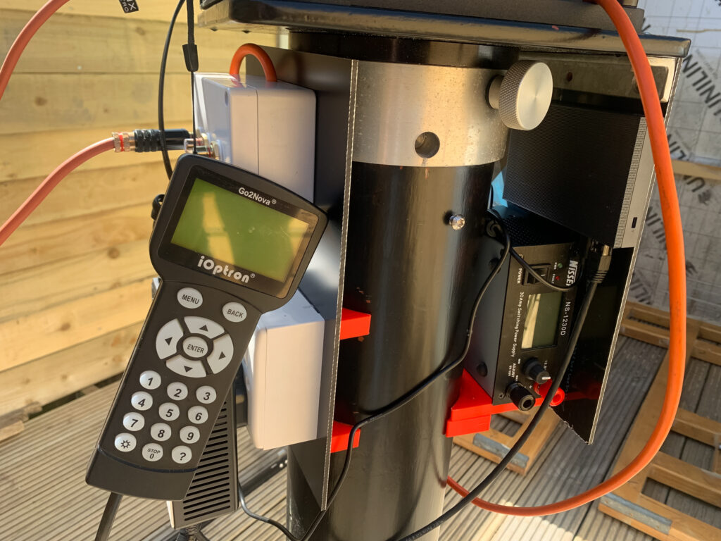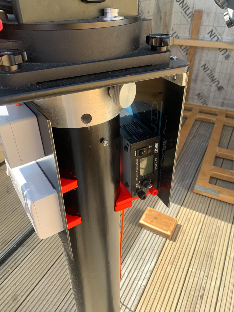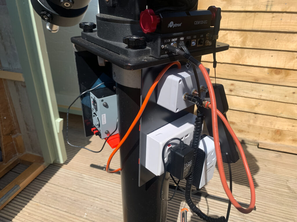 I’m running mains power up through the pier, from there, a 30 amp power supply provides 12 volts to the mount, dew heaters, mini PC and cameras through the ‘in mount’ cabling. I’m also using the Powerline system to get a wifi signal and ethernet to the observatory, so everything can be remotely operated from the house.