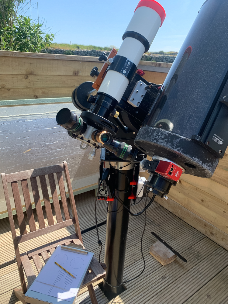 All finished and up and running making a solar observation through the TMB. Notice all the paint worn on the scope from the cover used to keep the moisture off in the old observatory. I’ll strip the scope down and repaint all the metalwork this coming winter.