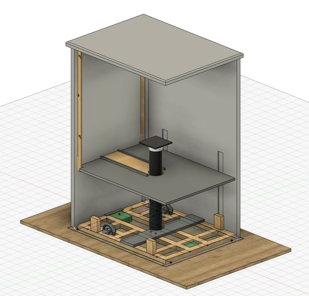 In the end I decided to radically rethink the whole observatory and came up with the above design, which is basically a roll off shed. I didn’t want to completely dismantle the previous observatory, so decided to keep the existing walls and place the new roll off shed design inside it. This gave me the advantage of some degree of wind protection for the structure inside. The box is partitioned into two compartments, the upper of which seals the mount, scope and all the electrics from the elements and can be heated during the winter if necessary.