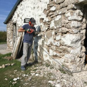 Well we’ve nearly got all of the rotting pointing out. Just a little bit more of the apex to go. Tomoz we start filling in the huge voids with mortar. That vertical line of stone means something. Perhaps the left hand side was not there when originally built, or maybe the door was twice the width than it is now. The join does go all the way to the top though!