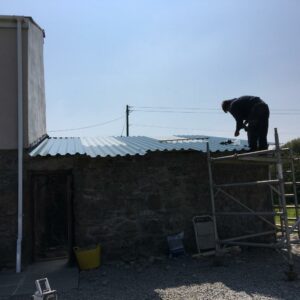Not exactly the expected early start due to traffic in Truro, but the sun is shining and it’s not windy. First there is the destruction. Then the piling up of the mess. Then all the beams and sheeting goes on before you get a chance to blink. A nice hefty bit of Tree Wood. The end of Day one. The plan is to do the other side tomorrow. If all goes well, when it…