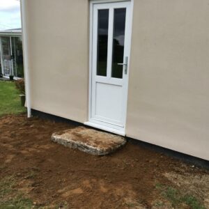 The slab of granite has been sitting by the door to the office for months. Now we have finally received the drop link stabiliser bolt, we have been able to get the back hoe back on Axel. Getting ready to start digging a shallow hole for the slap to sit in. Looking into the hole like all good workmen do! Pushing the slab into the hole and backfilling. Another little job completed.