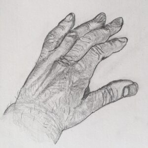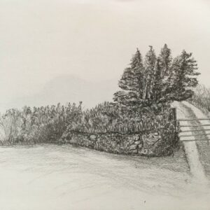 Three new drawings. This looked like shit early on and I was going to abandon it. One of those cases where more fiddling improves the picture – where normally you need to stop way before you think you should. My first landscape of the driveway and gate up to the cottage. A spilled glass of Wine buggered this up, so the drawing is unfinished.
